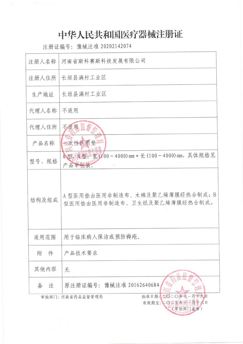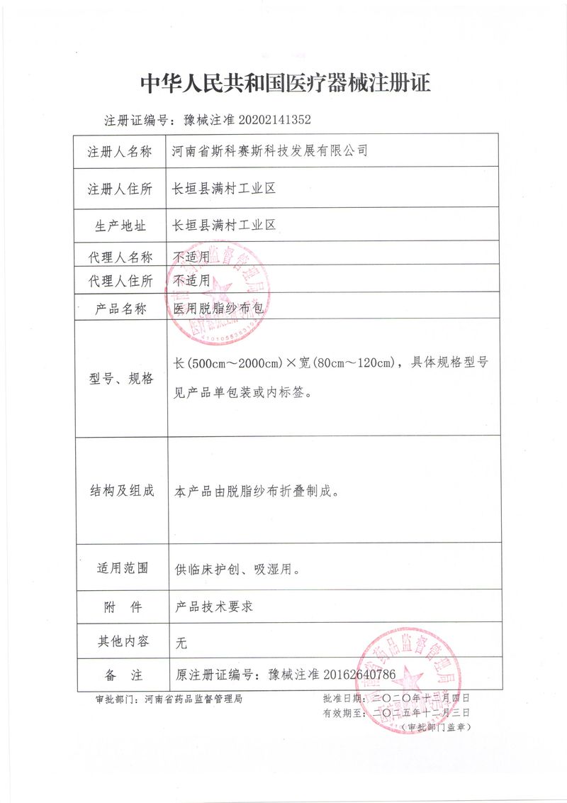 河南省斯科賽斯科技發(fā)展有限公司創(chuàng)建于 2011 年,位于“中國醫(yī)療耗材之都”- 河南省長垣縣,西臨 308 省道,南靠新菏鐵路,北依長濟高速,交通便捷,經(jīng)濟發(fā)達,環(huán)境優(yōu)美。斯科賽斯積極進入醫(yī)療健康和服務(wù)領(lǐng)域,秉承為用戶創(chuàng)造價值的理念,專注于醫(yī)用耗材解決方案的研發(fā)和運營,并為用戶提供完善的產(chǎn)品解決方案;  斯科賽斯主要生產(chǎn)醫(yī)用麻醉系列、醫(yī)用高分子系列、醫(yī)用敷料包系列、醫(yī)用無紡布系列、醫(yī)用防護系列、醫(yī)用脫脂棉系列、生物材料制品類等七大類、100 多個品種、400 多個規(guī)格的產(chǎn)品。公司占地面積約 30000 平方米,建筑面積20000 平方米,擁有 10 萬級的凈化車間總面積 10000 平方米。擁有國際先進水平的生產(chǎn)設(shè)備和檢測儀器,技術(shù)裝備精良,檢測手段完善,為醫(yī)療行業(yè)的不斷發(fā)展進步提供保障。公司順利通過 ISO9001、ISO13485 質(zhì)量管理體系認證?! ∷箍瀑愃箞猿盅邪l(fā)高科技新產(chǎn)品,力爭在醫(yī)療器械關(guān)鍵領(lǐng)域取得技術(shù)和研發(fā)的重大突破;立足國內(nèi)和國際兩個市場,逐步實現(xiàn)管理理念、經(jīng)營機制、人力資源、技術(shù)、產(chǎn)品、市場等全方位對接,提高企業(yè)的核心競爭力;過去的歲月里,斯科賽斯砥礪前行,誠信務(wù)實,銳意進取,不斷創(chuàng)新,用自己的睿智和辛勞,以富有責任感的使命,在探索中追求,在追求中超越,致力于成為值得信賴的醫(yī)療用品生產(chǎn)企業(yè)!在未來的日子里,斯科賽斯將一如既往豪情滿懷,信心百倍,攜手并肩,執(zhí)著追求,向更高的的目標前進,鑄造新的輝煌!